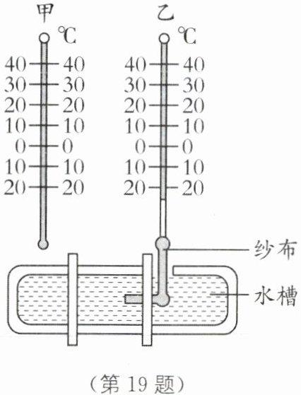 19.对比法(2025·陕西西安雁塔区期末)生活中有一种能反映空气中水蒸气含量的装置叫干湿泡湿度计.湿度大表明空气中水蒸气含量高.如图所示是由两个相同的温度计并列制成的,其中一个温度计被湿布包起来了,湿布放在装有水的水槽中.两个温度计的读数不一样,湿泡温度计的读数较小,这是由于湿布中的水