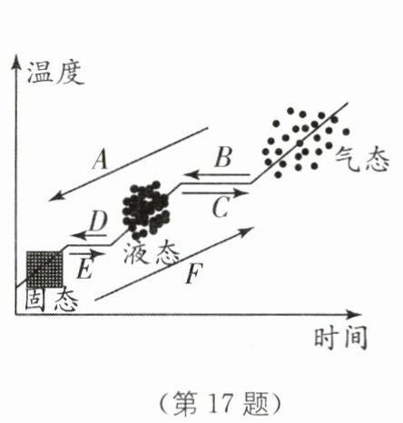17.(2025·陕西渭南韩城期末)如图所示,A、B、C、D、E、F分别表示一种物态变化,下列几种物态变化现象中:①马路上环卫车洒的水变干;②夏天,揭开冰棒包装纸后会看到冰棒冒"白气";③冬天,极地海水结冰;④放在衣柜里的樟脑丸会越来越小,最后"消失"了;⑤严冬的深夜,教室窗玻璃上结一层冰花.属于F物态变化的现象是