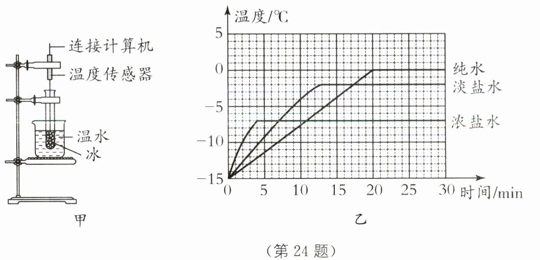 24.(7分)(2025·泰州海陵区期末)大雪过后路面结冰,环卫工人会在公路上撒盐,使路面的冰及时熔化,确保出行安全.为了弄清其中缘由,小明用相同水量的纯水、淡盐水、浓盐水分别制成冰,将冰捣碎后分别放入试管中,再将温度传感器探头插入碎冰中,再将试管置于盛有温水的烧杯中,如图甲所示.
