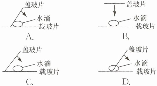 4. 正确盖盖玻片是成功制作临时装片的关键。如图制作临时装片时盖盖玻片的操作正确的是(