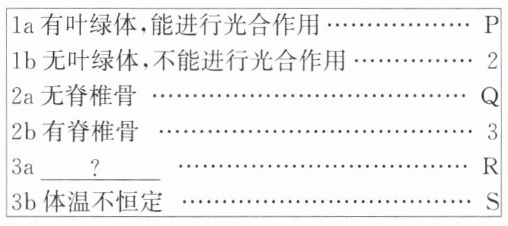 根据脊椎动物检索表,“体外受精,卵生”对应的是R类动物,“体内受精,卵生,体表有鳞片”对应的是S类动物,“体内受精,卵生,体表有羽毛”对应的是鸟类,“体内受精,胎生”对应的是哺乳类动物。