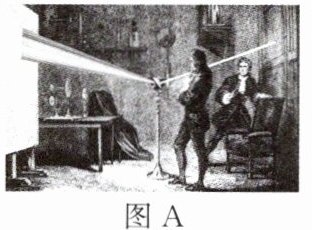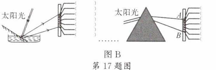 17. 如图A是牛顿曾经做过的光的色散实验。实验中将一束太阳光投射到玻璃三棱镜上,在棱镜后侧光屏上可以观察到一条彩色光带,颜色分别为红、橙、黄、绿、蓝、靛、紫。