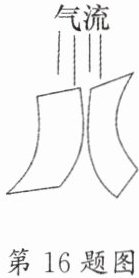 16. (重庆中考)如图所示,用双手分别捏着两张纸条的一端,使它们垂挂在胸前,猜测一下,如果沿两张纸条的中间向下吹气,可能会发生什么现象?操作一下,你看到了什么现象?对此你产生了什么疑问?将它记录在下面的横线上。