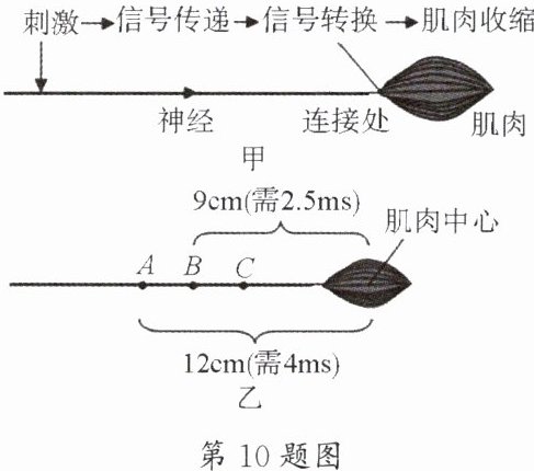 为了测出神经信号的传导速度,某生物学家做了如下实验。刺激点 $ A $ 至肌肉发生收缩,测得所需时间为 $ 4ms $(即 $ 4 × 10^{-3}s $),刺激点 $ B $ 至肌肉发生收缩,测得所需时间为 $ 2.5ms $。点 $ A $、$ B $ 离肌肉中心的距离分别为 $ 12cm $ 和 $ 9cm $。