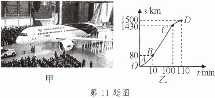 (2)由图乙可知,从B到C,飞机通过的路程与所用的时间成正比,则该段路程为匀速飞行阶段,由图可知,$s_{BC}=1430km-80km=1350km$,所用的时间$t_{BC}$$=100min-10min=90min=1.5h$,飞机定速巡航匀速飞行阶段的速度:$v'=\frac{s_{BC}}{t_{BC}}=\frac{1350km}{1.5h}=900km/h$。