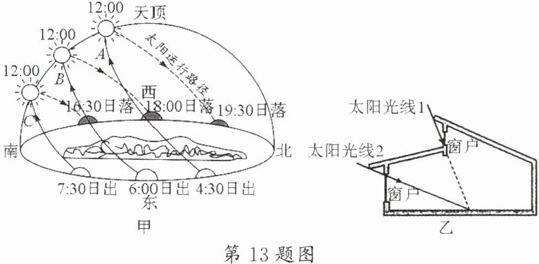 13. 图甲是我国首都北京(北纬$40^{\circ}$)二分(春分、秋分)二至(冬至、夏至)日的太阳运行路径;图乙是冬至、夏至两日的正午时刻,当地居民的节能建筑日照示意图。请读图并回答下列问题: