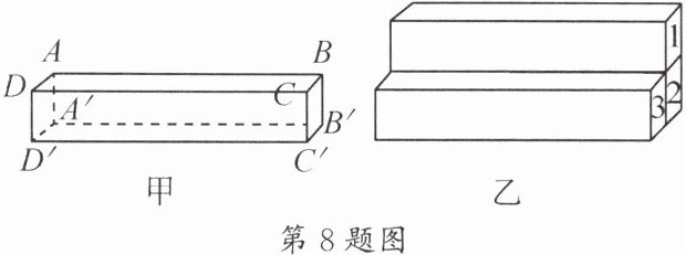 8. 为了测量图甲中长方体$AC'$两点的长度,取三个相同的长方体,按照图乙进行搭建;在图乙中,选择两点P、Q,用刻度尺进行测量即可。请把选择的两点在图乙中标出。