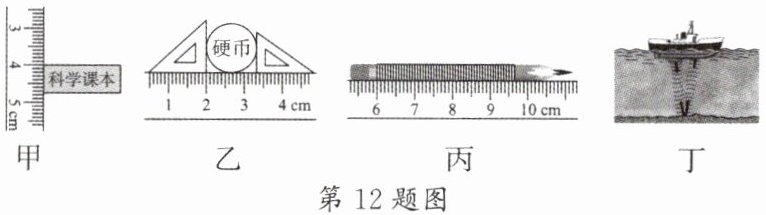 12. 如下四图分别表示测量科学课本一张纸厚度、硬币直径、铜丝直径、海底深度的方法,其中测量原理相同的是