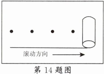 14. 小科想知道一个圆柱体的直径,身边除了一把刻度尺没有别的可用工具,小明帮他想了一个办法,在纸上先用直尺画一条直线,再在圆柱体上用墨水点一个小点,然后将圆柱体在纸上沿所画直线滚过去,纸上留下4个墨水点,用刻度尺测得第一个点和第四个点之间的距离为37.8mm,则测得该圆柱体的直径为(