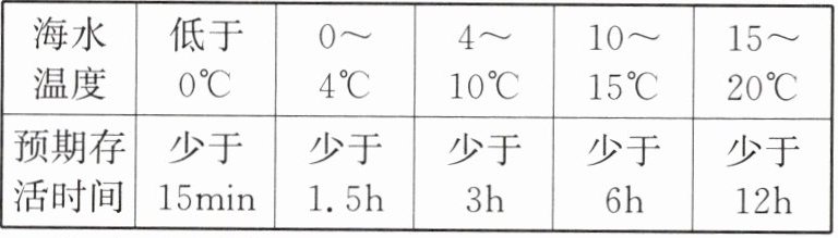 12. 海水温度直接影响海难遇险者的生存时长。下表中列出了人浸在不同温度海水中预期可能的存活时间。据表分析以下判断中错误的是 ( )