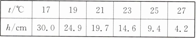 (2)小溪制作了乙温度计,$A$为一塑料瓶,$B$为吸管,通过软木塞与$A$相连,管下端插入水槽中,使管内外水面有一高度差$h$,在不同温度下分别测出对应水柱高度$h$,记录数据如表所示。请回答: