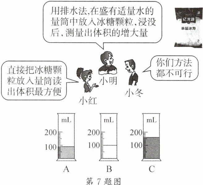 7. 小明最近从超市购买了一袋单晶冰糖,袋内有若干块冰糖且外形不规则,颗粒较大。小明想测此袋冰糖的体积,他邀请了本班的科学探究小组一起展开讨论。