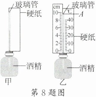 【制作】小明根据图甲制作温度计,并在硬纸上标定刻度值。查阅资料可知:在一定温度范围内,温度每升高 $1^{\circ}C$,酒精的体积变化量也相同,故温度计的刻度均匀。