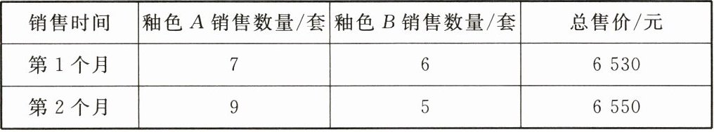 (1)设釉色A款瓷器每套的售价为a元,釉色B款瓷器每套的售价为b元,由题意得{7a+6b=6530,9a+5b=6550,解得{a=350,b=680。答:釉色A款瓷器每套的售价为350元,釉色B款瓷器每套的售价为680元。