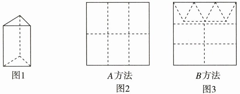如图 1,用正方形硬纸板做三棱柱盒子,每个盒子由 3 个形状、大小完全相同的长方形侧面和 2 个大小相等的等边三角形底面组成。硬纸板按两种方法裁剪,如图 2,A 方法:将一个正方形纸板分成 6 个形状、大小完全相同的长方形;如图 3,B 方法:将一个正方形纸板分成 4 个形状、大小完全相同的长方形(与 A 方法分成的长方形形状大小也相同)和 5 个大小相等的等边三角形(裁剪后边角料不再利用)。现有 10 张硬纸板,裁剪时,$x$ 张用 A 方法,剩余的用 B 方法。