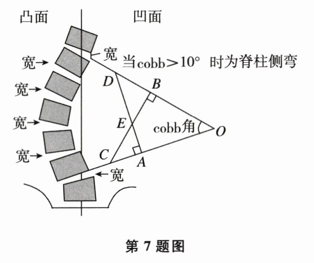7. 如图,这是脊柱侧弯的检测示意图,在体检时为方便测出cobb角∠O的大小,需将∠O转化为与它相等的角,则图中与∠O相等的角是( )