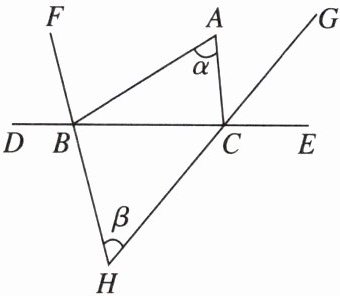 13. 如图,∠ABD和∠ACE是△ABC的外角,BF和CG分别是∠ABD和∠ACE的平分线,延长FB和GC交于点H。设∠A= α,∠H= β,则α与β之间的数量关系为______。