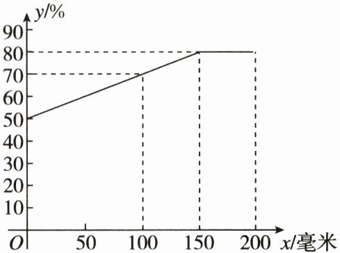 (2)由函数图象可知,当x>150时,y不变,所以当x = 150时,y = $\frac{1}{5}$×150 + 50 = 80,所以甘蔗种子种植后20天累计降雨量达到180毫米时,甘蔗的出苗率是80%。