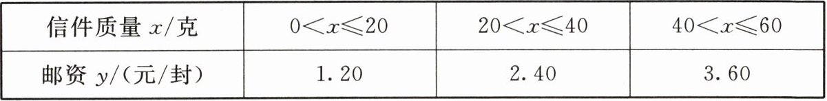 | 邮资y/(元/封) | 1.20 | 2.40 | 3.60 |