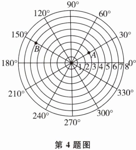 4如图,这是一台雷达探测相关目标得到的结果,若记图中目标A的位置为(3,30°),目标B的位置为(6,150°),现有一个目标C的位置为(8,m°),且到目标B的距离为10,则目标C的位置为______。