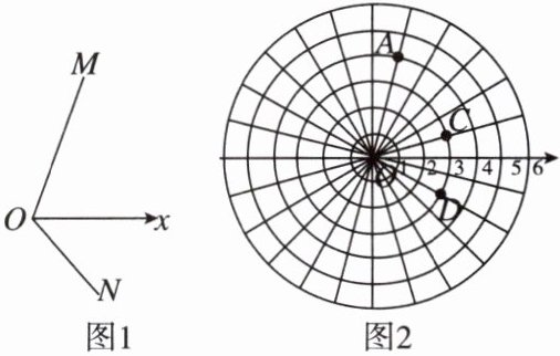5如图1,点M到点O的距离为5个单位,OM与Ox的夹角为70°(Ox的逆时针方向),则点M的位置表示为(5,70°);同理,点N到点O的距离为3个单位,ON与Ox的夹角为50°(Ox的顺时针方向),则点N的位置表示为(3,-50°)。