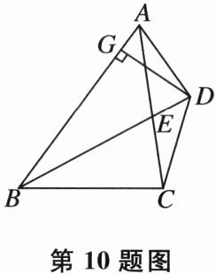 10. 如图,BD平分∠ABC,且∠BEC= ∠BCE,D为BE延长线上的一点,BD= BA,过D作DG⊥AB,垂足为G。下列结论:①△ABE≌△DBC。②∠BCE+∠BCD= 180°。③AD= AE= DG。④BA+BC= 2BG。其中正确的是 ( )