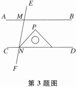 3 如图,$AB// CD$,直线$EF分别交AB$,$CD于M$,$N$两点,将一个含有$45^\circ$的直角三角尺按图中所示的方式摆放,若$\angle EMB= 80^\circ$,则$\angle PNM= $______$^\circ$。