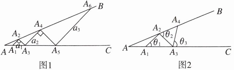(2)因为A₁A₂=AA₁,所以∠A₁AA₂=∠AA₂A₁=θ,所以∠A₂A₁A₃=θ₁=θ+θ,即θ₁=2θ。同理可得θ₂=3θ,θ₃=4θ。故答案为4θ。