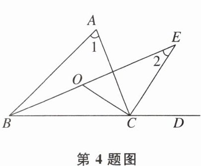 4 如图,在△ABC中,∠ABC,∠ACB的平分线BO,CO交于点O,CE为△ABC的外角∠ACD的平分线,BO的延长线交CE于点E,∠1= α,则∠2的大小为 。(用含α的式子表示)