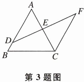 3 如图,在△ABC中,D是AB上一点,DF交AC于点E,DE= EF,AE= EC,给出下列结论,①∠ADE= ∠EFC;②∠ADE+∠ECF+∠FEC= 180°;③∠B+∠BCF= 180°;④S△ABC = S四边形BCFE。其中,正确的结论有 个。