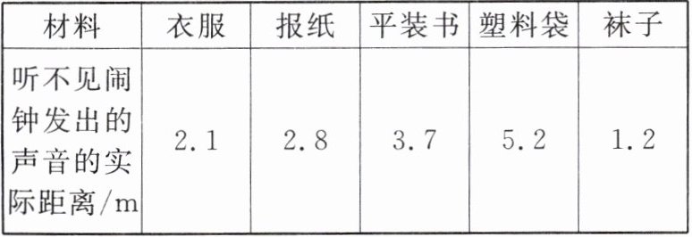 | 听不见闹钟发出的声音的实际距离/m | 2.1 | 2.8 | 3.7 | 5.2 | 1.2 |