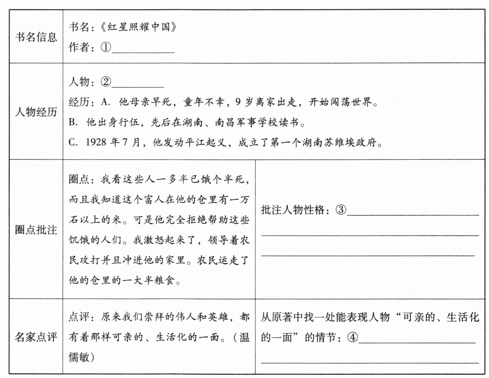 ①埃德加·斯诺 ②彭德怀 ③疾恶如仇(或:有正义感),同情饥民,有组织和领导才能。 ④示例一:当周恩来陪斯诺走在回百家坪的路上时,他就和走在他身边的“红小鬼”一样,显得轻松愉快;他还把胳膊爱护地搭在“红小鬼”的肩上。我们从中可看出他的平易近人和对生命的热爱,这就是他可亲的生活化的一面。 示例二:贺龙在长征路上背着许多受伤的部下行军;他还在当国民党的将领时,他的生活也跟他的部下一样简单。他不计较个人财物,但喜欢马,有一次他非常喜欢的一匹马被敌军俘获了,贺龙又去打仗将马夺了回来。这就是他可亲的生活化的一面。 示例三:有一次,毛泽东把自己的上衣脱下来给一位在前线受伤的弟兄穿;当红军战士没有鞋穿的时候,他也不愿意穿鞋;他关心士兵。有一天在和斯诺谈话的时候,他心不在焉地松下了裤带,搜寻着什么寄生物;有一次斯诺访问林彪的时候,小窑洞里非常热,毛泽东把身子向床上一躺,对着壁上的军用地图,仔细研究了二十分钟。他不拘小节。这就是他可亲的生活化的一面。