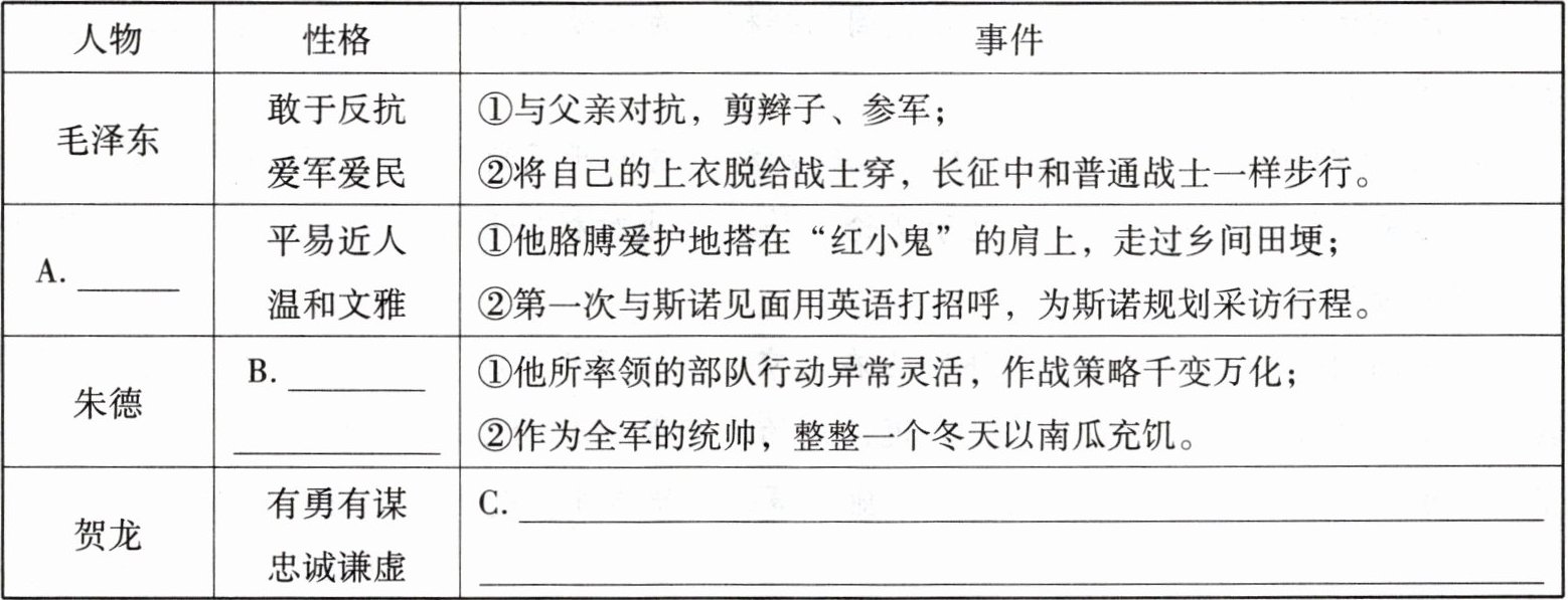 (2)下面是一位同学在阅读《红星照耀中国》时制作的关于领袖人物形象的表格,还有三处未填出,请帮他补充完整。