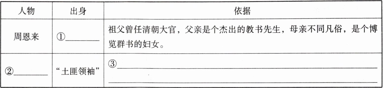 (2)①大官僚家庭 ②贺龙 ③对富人怀恨在心。被国民党报刊称作“劣迹昭著”,带领着村中的一些人去攻击收税者,用一把砍刀将他们砍死,使其缴械。