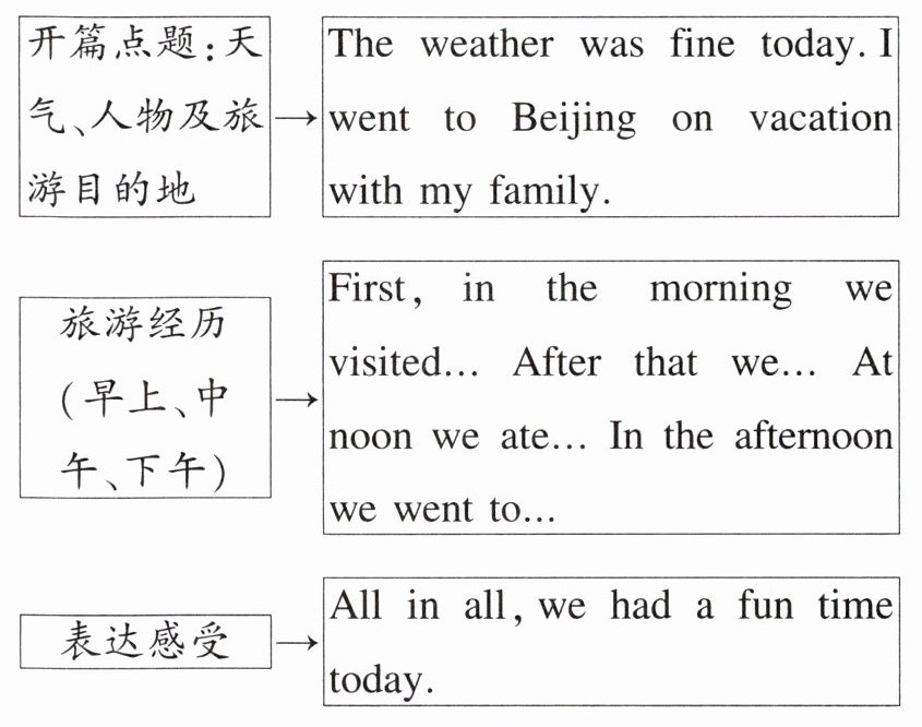 内容:记录当天去某地的旅游经历,着重记录你所看到的、听到的和你的感受