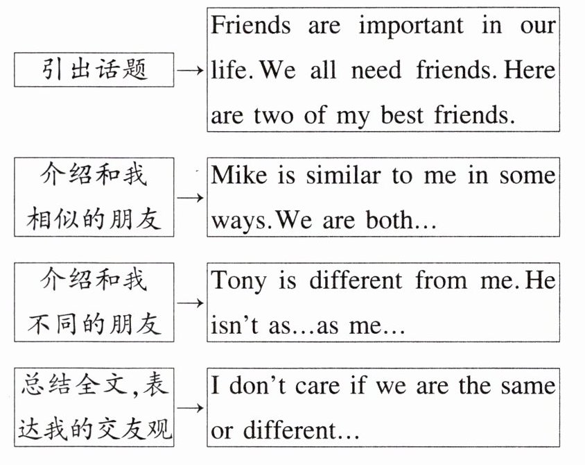 人称:描述朋友与我的共同点,用第一人称we;描写与朋友的不同点,用第一人称I和第三人称he, she