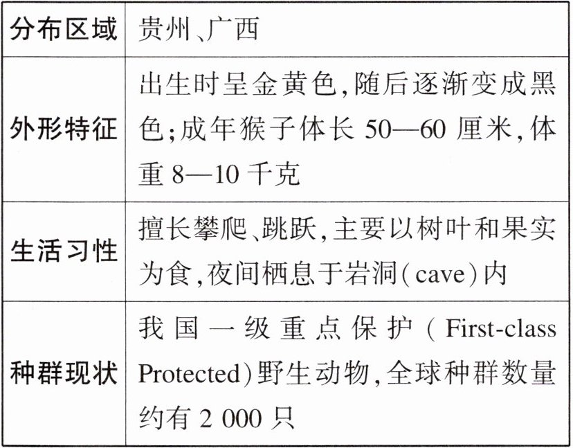 One possible version:The cute animals in the picture are Francois' leaf monkeys.They live in some areas in Guizhou and Guangxi.Though the adult monkeys are black,their babies are golden at birth.Later their fur will gradually turn black.Adult monkeys are 50 to 60 cm in length and 8 to 10 kg in weight.Francois' leaf monkeys are not only good at climbing,but also skilled at jumping.They mainly feed on leaves as well as fruit.At night,they prefer to sleep in caves instead of trees.Francois' leaf monkeys are First-class Protected Wild Animals in China.The global population is about 2,000.They are in great danger.Let's take action to protect them.