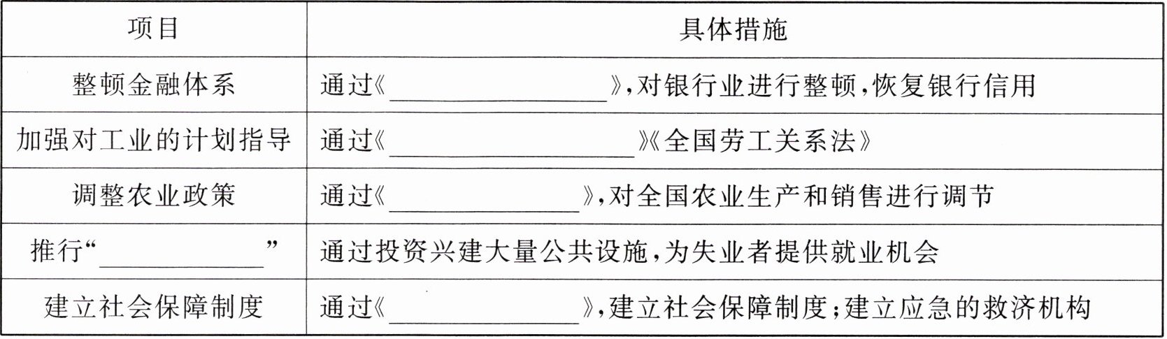 |推行“______”|通过投资兴建大量公共设施,为失业者提供就业机会|