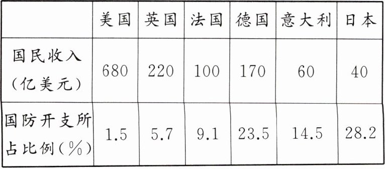 7.(跨学科:数学)下表是1937年各大国国民收入以及国防开支所占比例,可用于研究( )
