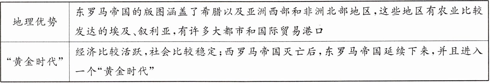 |“黄金时代”|经济比较活跃,社会比较稳定;西罗马帝国灭亡后,东罗马帝国延续下来,并且进入一个“黄金时代”|
