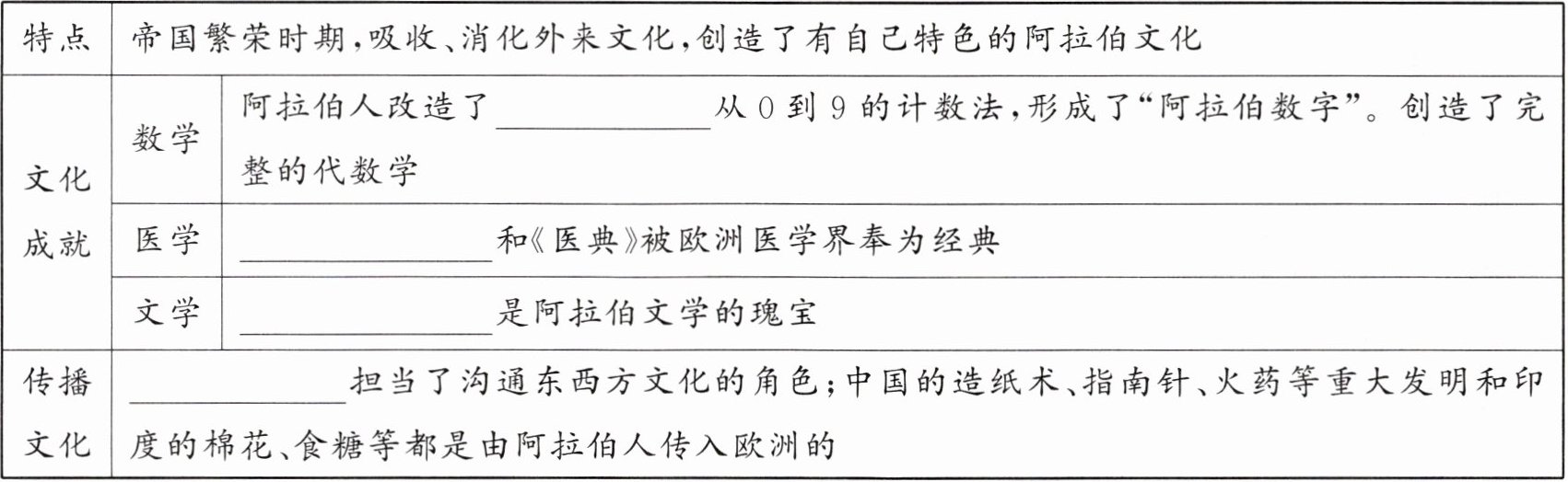 | 文化成就 | 数学 | 阿拉伯人改造了______从0到9的计数法,形成了“阿拉伯数字”。创造了完整的代数学 |