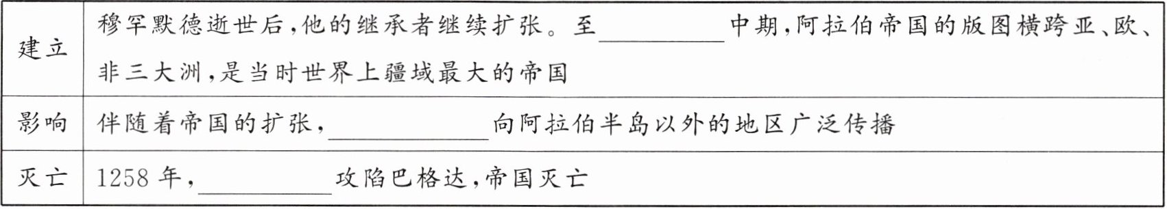 | 影响 | 伴随着帝国的扩张,______向阿拉伯半岛以外的地区广泛传播 |