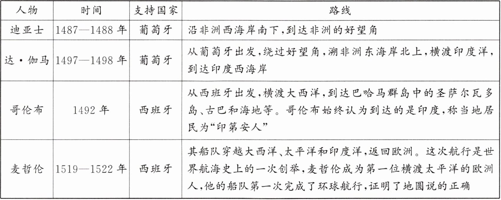 |达·伽马|1497—1498年|葡萄牙|从葡萄牙出发,绕过好望角,溯非洲东海岸北上,横渡印度洋,到达印度西海岸|