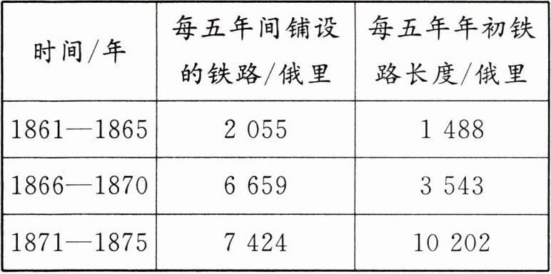 | 时间/年 | 每五年间铺设的铁路/俄里 | 每五年年初铁路长度/俄里 |