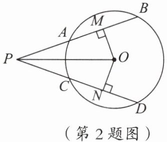 2.[一模·淮安]如图,已知AB和CD是$\odot O$的两条等弦. $OM\perp AB$、$ON\perp CD$,垂足分别为M、N,BA、DC的延长线交于点P,连接OP. 下列四个说法中:①$\widehat{AB}= \widehat{CD}$;②$OM= ON$;③$PA= PC$;④$\angle BPO= \angle DPO$. 正确的个数是( )