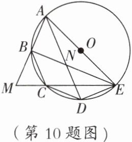 10.[期末·绵阳]如图,在⊙O的内接五边形ABCDE中,AD和BE交于点N,AB和EC的延长线交于点M,CD//BE,BC//AD,BM= BC= 1,点D是$\overset{\frown}{CE}$的中点.
