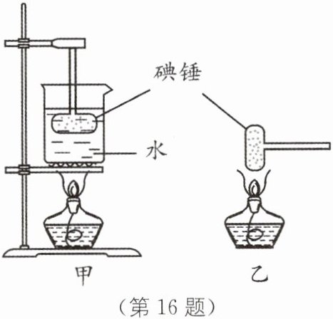 16. 小明在观察“碘锤”中的物态变化之前,查阅资料得知:酒精灯外焰的温度约为$800^{\circ }C$,碘的熔点为$113.7^{\circ }C$. 采用图中的两种方式加热. 图甲中的碘颗粒吸热会