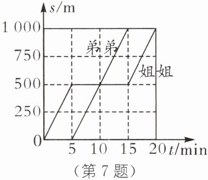 C [解析]本题考查 $ s - t $ 图像. 根据路程与时间的关系分析运动状态和速度. 姐姐零时刻出发, 弟弟第 $ 5 \min $ 开始运动, 故弟弟比姐姐晚 $ 5 \min $ 离开家, 故 A 错误; 弟弟和姐姐通过的路程相同, 弟弟总用时 $ t _ { 1 } = 15 \min - 5 \min = 10 \min $, 姐姐总用时 $ t _ { 2 } = 20 \min $, 由此可知, 弟弟平均速度大, 故 B 错误; 姐姐在 $ 0 \sim 5 \min $ 和 $ 15 \sim 20 \min $ 内行走, $ 5 \sim 15 \min $ 内没有行走, 姐姐在 $ 0 \sim 5 \min $ 和 $ 15 \sim 20 \min $ 内通过的路程均为 $ 500 \mathrm { m } $, 则姐姐行走时的速度为 $ v _ { 2 } = \frac { s _ { 2 } } { t _ { 2 } ^ { \prime } } = 100 \mathrm { m } / \min $, 弟弟的速度 $ v _ { 1 } = \frac { s _ { 1 } } { t _ { 1 } } = \frac { 1000 \mathrm { m } } { 10 \min } = 100 \mathrm { m } / \min $, 两人行走时的速度相等, 故 C 正确, D 错误.