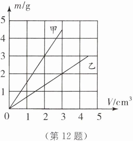 12. 甲、乙两种物质的质量与体积的关系图像如图所示,由图可知,其中密度较大的是