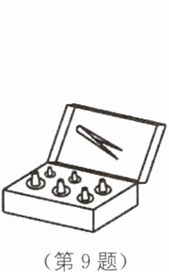 9. 物理实验中经常需要进行测量,如图所示是某架天平配套使用的砝码盒,盒内的砝码有 $ 100 \text{ g} $一个、 $ 50 \text{ g} $一个、 $ 20 \text{ g} $两个,剩下的砝码是